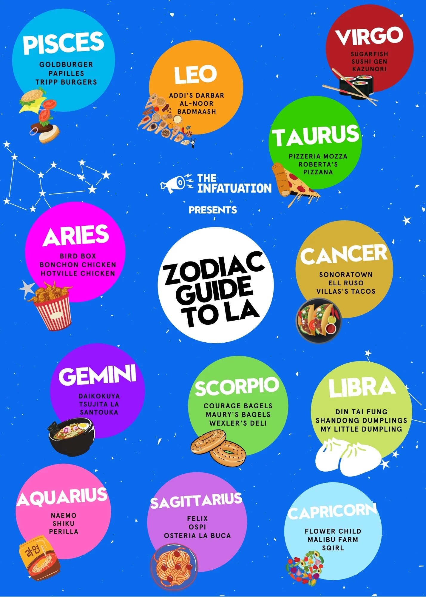 Goal: For natives and visitors alike to explore the unique culinary scene in Los Angeles using The Infatuation Zodiac Guide To LA.
